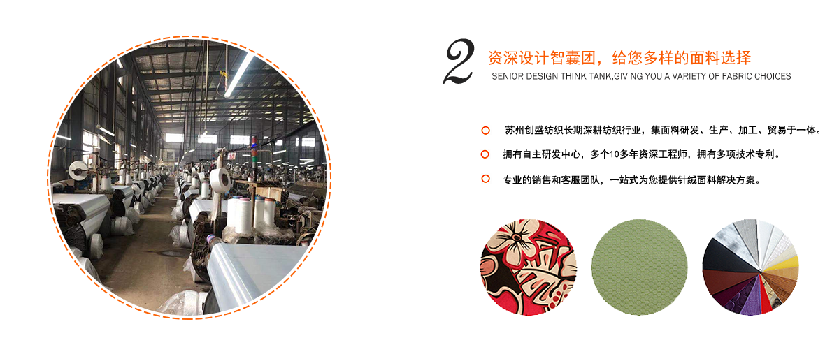 蘇州創(chuàng)盛紡織有限公司坐落于江蘇省吳江市盛澤鎮(zhèn)圣塘村,自2004年成立以來,一直致力于中高檔功能型環(huán)保梭織面料的研發(fā)與經(jīng)營,創(chuàng)盛紡織在專注幾十年面料經(jīng)營中,不斷的完善管理,嚴格的把控品質(zhì),精準的創(chuàng)新產(chǎn)品,從而讓每一款面料滿足不同客戶的個性化需求,產(chǎn)品廣泛適用于:嬰兒用品、戶外旅行用品、運動休閑用品、箱包手袋、家庭收納用品等領(lǐng)域。